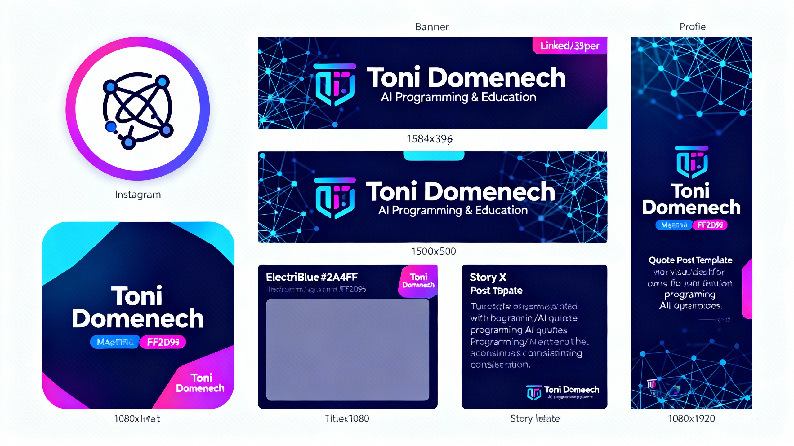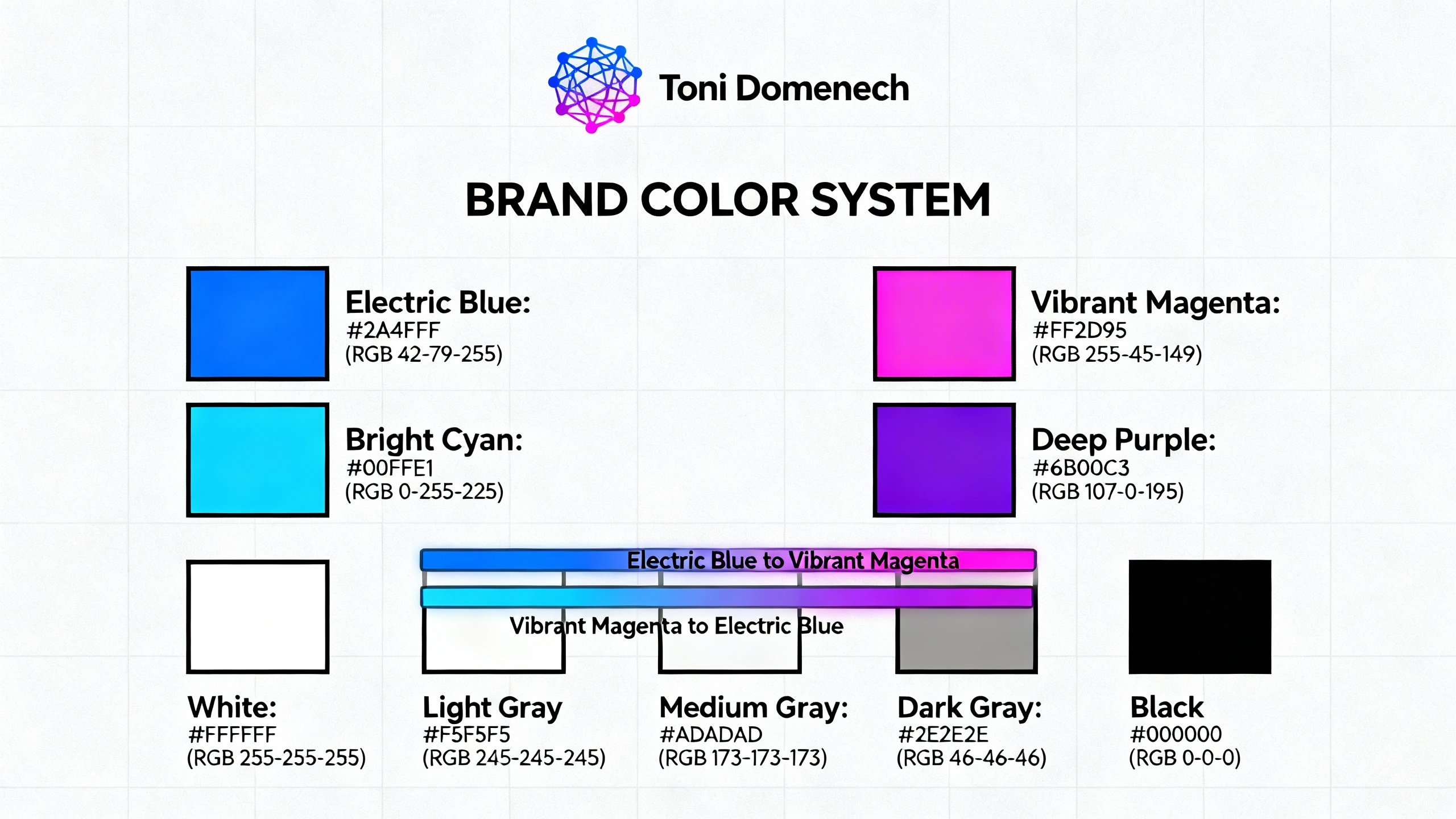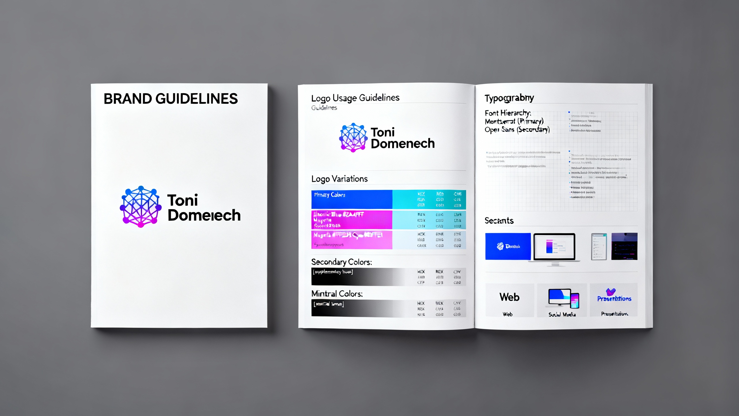 • Prompt: Créame la imagen de marca personal Toni Doménech. Necesito: logo, paletas de colores a usar, tipografías, libro de marca y cualquier otro material necesario para que esté completo, mi web es https://tonidomenech.space